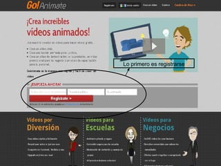 El documento proporciona instrucciones para crear un video animado en GoAnimate. Explica los pasos de registro en la plataforma, seleccionar personajes, fondos y acciones, agregar objetos, efectos y narración, y finalmente guardar y compartir el video terminado.