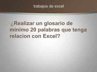 Este documento presenta información sobre Excel. Explica que Excel tiene hasta 1048576 filas numeradas y columnas identificadas con letras hasta la XFD. Proporciona ejemplos de cinco fórmulas comunes en Excel como sumar celdas, referenciar celdas en fórmulas, usar rangos de celdas, repetir fórmulas y posibles problemas al extender fórmulas. También incluye un glosario de 20 términos relacionados con Excel como gráfica, fórmula y datos.
