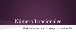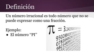 Este documento define los números irracionales como aquellos que no pueden expresarse como una fracción. Explica que son números con infinitos decimales como π y las raíces cuadradas de los números primos. Finalmente, clasifica los irracionales en algebraicos, que surgen de ecuaciones algebraicas, y trascendentes, relacionados con funciones trigonométricas y logaritmos.