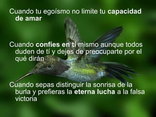 El documento presenta una lista de cualidades y actitudes que definen a un triunfador, como saber amar sin que el egoísmo limite esa capacidad, confiar en uno mismo a pesar de las dudas de los demás, distinguir la sinceridad de la burla, actuar por convicción y no por adulación, saber ser pobre sin perder la riqueza ni rico sin perder la humildad, perdonar fácilmente, tratar a ricos y pobres por igual, saber guardar silencio cuando no se le pide la palabra, aceptar los propi