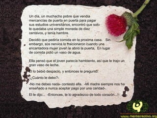 Un estudiante pobre pidió un vaso de agua a una mujer pero ella le dio un vaso de leche. Años después, el estudiante se convirtió en doctor y curó a la mujer cuando estaba enferma sin cobrarle por sus servicios médicos en reconocimiento a su acto de caridad en el pasado al darle leche cuando tenía hambre.