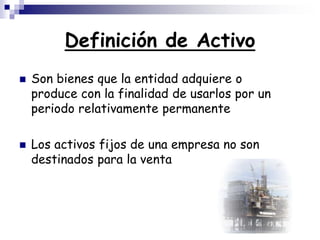 El documento define los activos fijos como bienes que una entidad adquiere o produce para usarlos por un periodo prolongado. Explica que los activos fijos pueden ser tangibles o intangibles y que se deprecian a lo largo de su vida útil mediante métodos como línea recta o suma de dígitos. También establece que los costos posteriores a la adquisición se capitalizan si mejoran las condiciones del activo por encima de su rendimiento original.