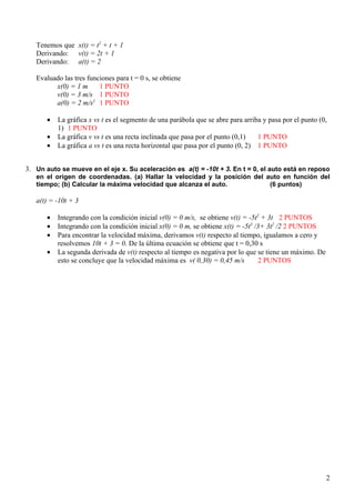 Este documento presenta la solución a tres problemas de física relacionados con el movimiento de partículas y vehículos. En el primer problema, se pide graficar la velocidad y aceleración en función del tiempo para una araña que se mueve a lo largo del eje x. En el segundo problema, se dan la ecuación de posición de una partícula y se pide hallar sus valores iniciales de posición, velocidad y aceleración, así como graficar estas variables en función del tiempo. El tercer problema analiza el movimiento de un auto cuya aceler