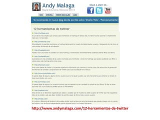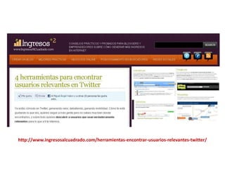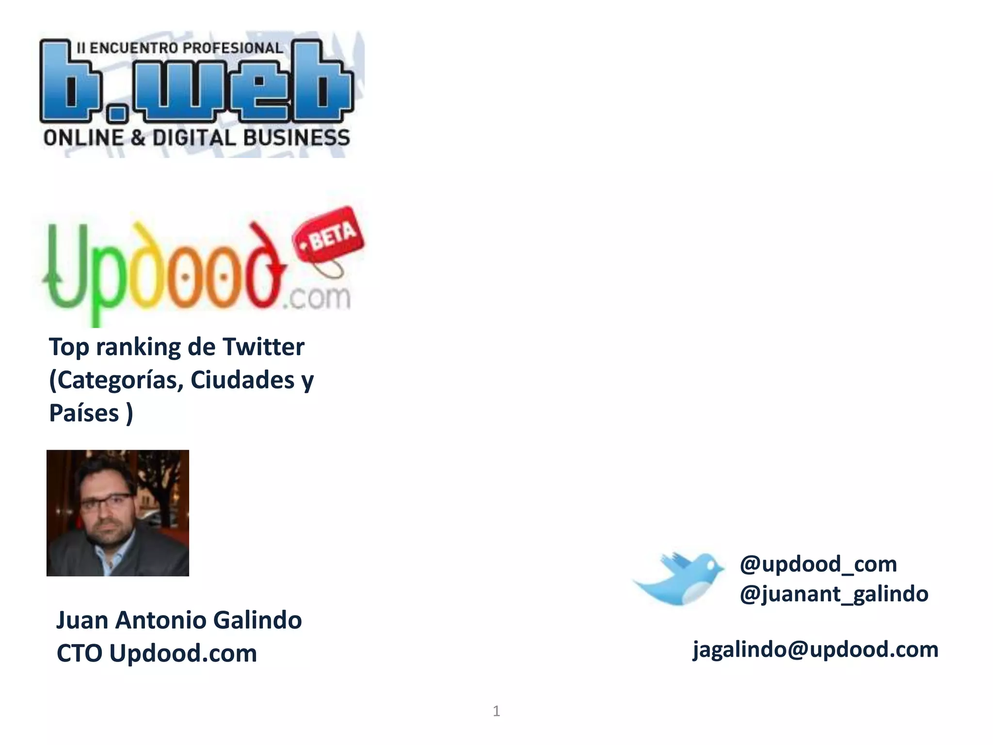 El documento presenta un ranking de tuiteros por categorías, ciudades y países a partir de una base de datos que incluye más de 30 millones de usuarios de Twitter. Se mencionan ejemplos de rankings tanto de futbolistas como de tuiteros de A Coruña y se incluyen varios enlaces a recursos externos. La información indica que el acceso a la API de Twitter ha sido autorizado desde julio de 2010.