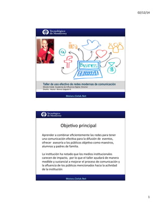 Este documento presenta un taller sobre el uso efectivo de redes modernas de comunicación. El objetivo principal del taller es aprender a combinar eficientemente las redes para tener una comunicación efectiva y ofrecer asesoría a públicos como maestros, alumnos y padres de familia. El taller incluirá temas como los cambios en el comportamiento del consumidor, herramientas de comunicación y medición.