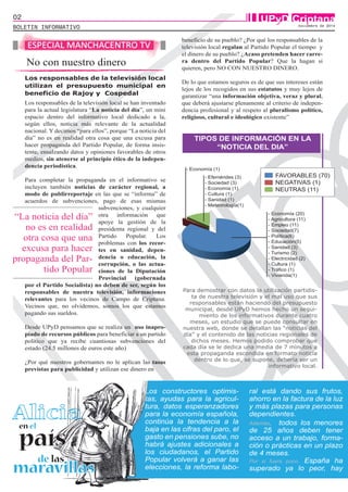 El documento critica la propaganda electoral del Partido Popular a través de la televisión local, que usa el presupuesto municipal para promover al partido en el poder. Se analizan las noticias del día, que en un 70% son favorables al PP y sus políticas, mientras que temas como recortes o corrupción no se cubren. UPyD pide que la televisión sea independiente y sirva a todos los vecinos, no solo al partido gobernante.