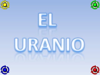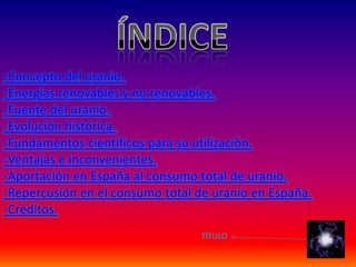 Este documento trata sobre el uranio, un elemento químico metálico usado principalmente como combustible en reactores nucleares. Explora el concepto, fuentes, evolución histórica, usos y ventajas e inconvenientes del uranio. España consume relativamente poca cantidad de uranio y obtiene la mayoría que usa de una sola compañía nacional productora.