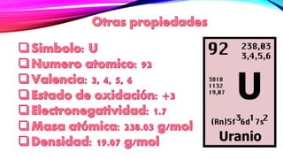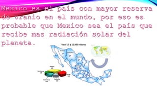 El documento proporciona información sobre yacimientos de uranio en México, incluyendo las reservas en los estados de Chihuahua, Durango y Veracruz. Se descubrió el uranio en 1789 y se ha encontrado en varias localidades de Chihuahua, así como en la cuenca de Burgos y la sierra de Aconchi en Durango. México tiene la mayor reserva de uranio en el mundo, aunque aún no se ha explotado, y varios países quieren que el estado de Chiapas se independice para poder acceder a sus reserv