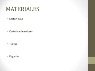 Este documento proporciona una lista de materiales necesarios para un proyecto que incluye cartón paja, cartulina de colores, tijeras y pegante.