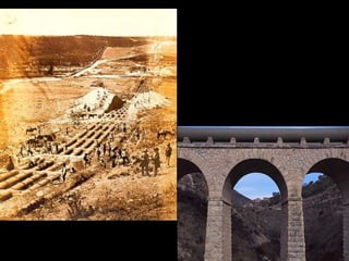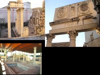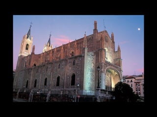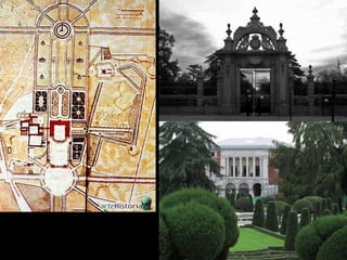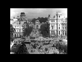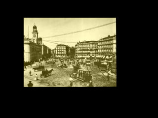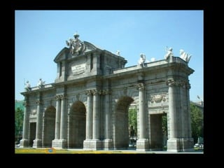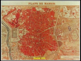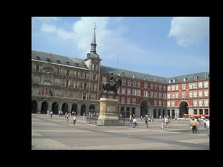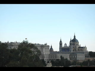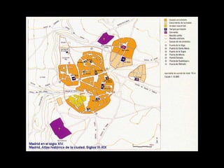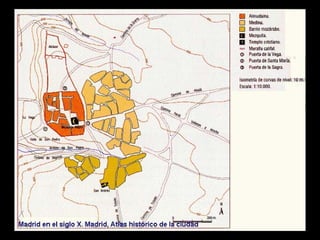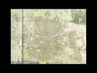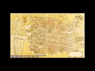 El documento describe la historia de asentamientos humanos en la región de Madrid desde el Paleolítico hasta la época romana. Complutum (Alcalá de Henares) fue el único centro importante durante el período romano, aunque declinó durante el Bajo Imperio. En la Edad Media, se construyó una fortaleza musulmana en el lugar que ahora ocupa el Palacio Real de Madrid. Tras la Reconquista, Madrid comenzó a ganar importancia política a medida que los monarcas se volvieron más sedentarios.