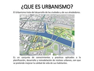 El urbanismo trata del desarrollo de las ciudades y sus alrededores con el objetivo de mejorar la calidad de vida de sus habitantes. Una urbanización es una concentración de población y actividades humanas en un espacio específico que cambia la forma y dinámicas de la zona, creando nuevas leyes de vida. Mientras que el urbanismo se refiere a ciudades y núcleos urbanos en general, una urbanización se refiere específicamente a un desarrollo residencial planificado con viviendas, servicios y acceso