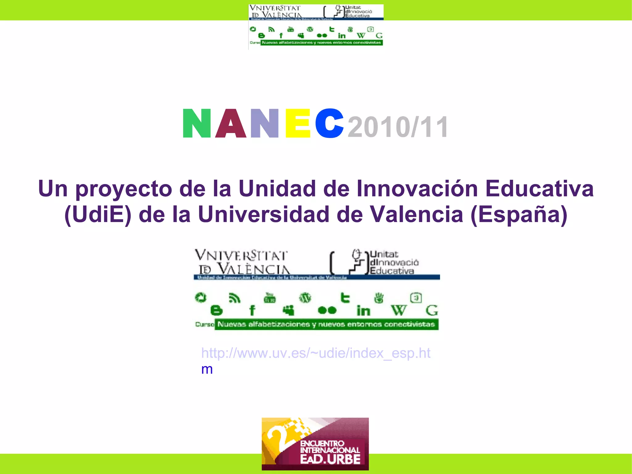 NANEC 2010/11 fue un curso abierto y bilingüe sobre nuevas alfabetizaciones y entornos conectivistas ofrecido por la Universidad de Valencia entre noviembre de 2010 y marzo de 2011. Contó con la participación de 178 estudiantes de 14 países y especialistas internacionales. El curso utilizó plataformas como Elluminate, Second Life y foros para ofrecer sesiones síncronas y asíncronas que cubrían temas como el cambio en entornos digitales, el funcionamiento de las redes y la creación de proyect
