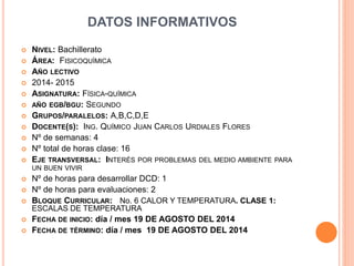 Este documento presenta la planificación de una clase de Física-Química de segundo año de bachillerato. La clase abordará el tema de escalas de temperatura, con objetivos como diferenciar los conceptos de calor y temperatura. La clase involucrará actividades como discusiones en parejas sobre estos conceptos y la elaboración de cuadros comparativos. Los estudiantes aprenderán mediante explicaciones, ejemplos de la vida diaria y la realización de organizadores gráficos. Su aprendizaje será evaluado mediante prue