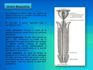 La uretra es el conducto que transporta la orina desde la vejiga hasta el exterior del cuerpo. En los hombres mide unos 20 cm y pasa por la próstata, mientras que en las mujeres mide entre 2.5-4 cm. La uretra cumple funciones excretoras y reproductivas.