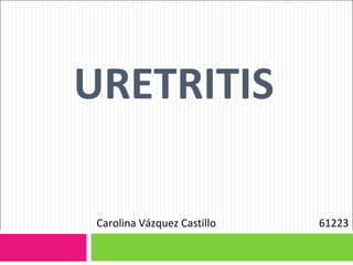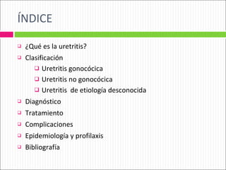 Este documento describe la uretritis, una inflamación de la uretra que causa dolor y secreción. Explica que la uretritis puede ser gonocócica, causada por la bacteria Neisseria gonorrhoeae, o no gonocócica, causada por otras bacterias como Chlamydia trachomatis. Detalla los síntomas, diagnóstico, tratamiento y complicaciones potenciales de ambos tipos de uretritis, así como su epidemiología y medidas preventivas.