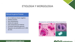 Este documento describe la uretritis gonocócica, una infección causada por la bacteria Neisseria gonorrhoeae. La uretritis gonocócica se transmite por contacto sexual y causa secreción purulenta, dolor y ardor en la uretra. El diagnóstico se realiza mediante tinción de Gram o cultivo de la secreción uretral. El tratamiento consiste en antibióticos.