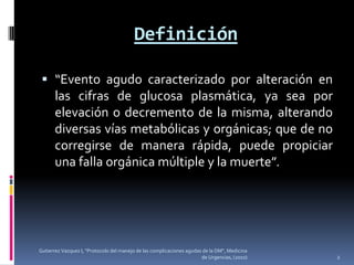 Este documento describe las urgencias en diabetes mellitus, incluyendo la definición, historia, epidemiología y clasificación de estados hiperglucémicos e hipoglucémicos. Explica que la cetoacidosis diabética y el estado hiperosmolar hiperglicémico son complicaciones metabólicas agudas y potencialmente mortales en pacientes con diabetes. Además, señala que la falta de terapia con insulina, infecciones graves y otras situaciones de estrés son factores frecuentes que desencadenan estas emergencias di