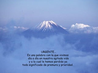 El documento enfatiza que la palabra "urgente" ha perdido su significado real en nuestras vidas ajetreadas. Propone que lo verdaderamente urgente es detenerse para apreciar la vida, la naturaleza, el tiempo con los seres queridos y sentirse vivo. También sugiere que es urgente vivir cada día en lugar de llenar la agenda con actividades sin valorar realmente la vida.