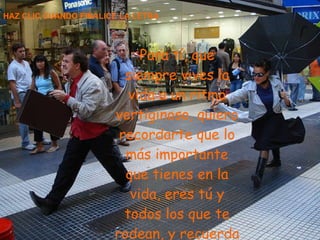 El documento enfatiza la importancia de vivir cada día sin prisas y valorando a los seres queridos. Resalta que lo verdaderamente urgente es tomarse pausas para apreciar pequeños momentos como saludar al sol cada mañana, pasar tiempo con la familia y decirle a los demás cuánto los queremos. También enfatiza la necesidad de vivir cada día con gratitud y consciencia de que somos hijos de Dios.