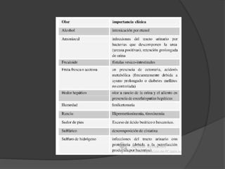 Este documento proporciona una revisión histórica del análisis de orina y describe los componentes clave de un análisis de orina completo, incluidos los rangos de referencia. Explica cómo el examen de orina ha evolucionado desde la antigüedad y actualmente incluye observaciones macroscópicas y microscópicas de la orina, así como pruebas químicas para detectar glucosa, proteínas, sangre y otros componentes.