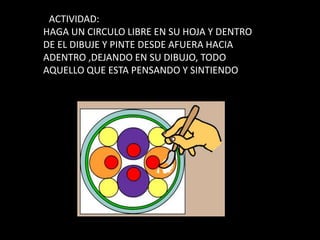 El documento instruye al lector a dibujar un círculo mágico en una hoja y luego pintar o dibujar desde afuera hacia adentro, dejando en el dibujo todos sus pensamientos y sentimientos para calmar la mente y centrarse en sí mismo.