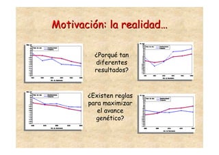 Este documento discute varios factores que afectan el progreso genético en la selección animal, incluyendo la heredabilidad, el diferencial de selección y el intervalo generacional. Explica que cuanto mayor sea la variación genética, heredabilidad y diferencial de selección, y menor sea el intervalo generacional, mayor será el progreso genético que se puede lograr. También enfatiza la importancia de medir con precisión las características de interés y aprovechar los animales seleccionados de manera más eficiente.