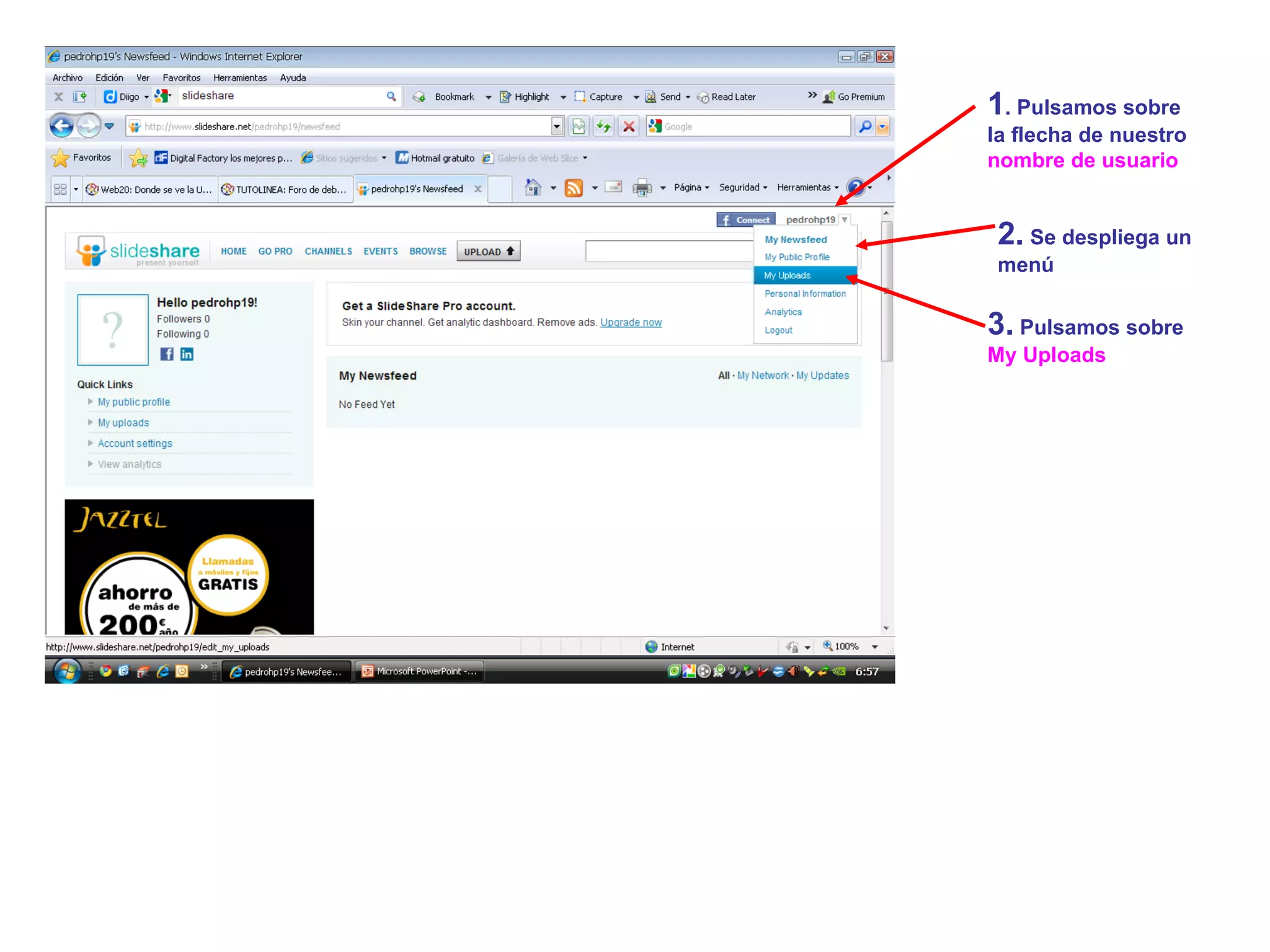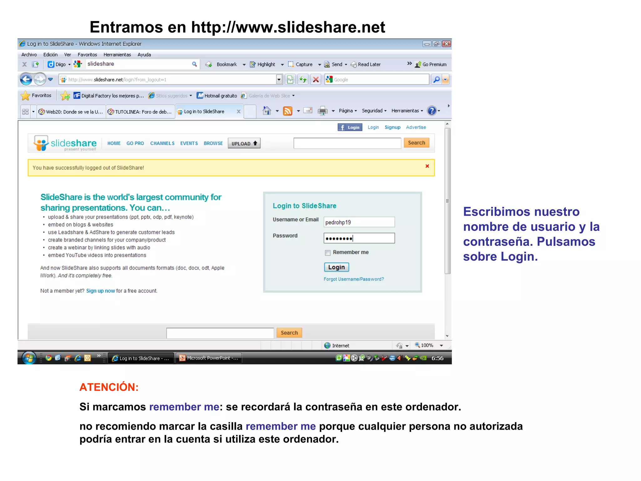 El documento describe los pasos para iniciar sesión en SlideShare y acceder a las presentaciones subidas por el usuario. Se recomienda no marcar la casilla "remember me" para evitar que otras personas no autorizadas accedan a la cuenta desde ese ordenador. Una vez iniciada la sesión, el usuario puede ver y acceder a sus presentaciones subidas haciendo clic en "My Uploads".