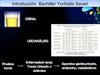 El documento describe las etapas del desarrollo de los riñones en el embrión humano, incluyendo el pronefros, mesonefros y metanefros. También describe la anatomía, fisiología e histología de los riñones definitivos, así como la recolección y análisis de muestras de orina.