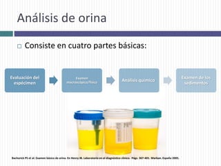 El documento describe los cuatro pasos básicos del análisis de orina: evaluación del espécimen, examen macroscópico, análisis químico y examen de sedimentos. En el examen macroscópico se evalúa el color, claridad, volumen, peso específico y osmolalidad de la orina para determinar el estado de hidratación y posibles anormalidades.