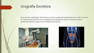 La urografía excretora es un estudio radiológico del sistema urinario que permite ver su anatomía y fisiología mediante la aplicación de un medio de contraste por vía intravenosa. El estudio consiste en tomar varias placas radiográficas en diferentes momentos para visualizar los riñones, vías urinarias y vejiga, y puede detectar anormalidades como cálculos, tumores, masas u obstrucciones.