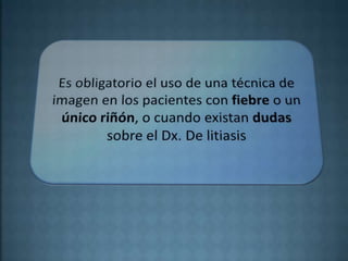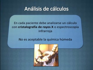 La litiasis renal es más frecuente entre los 20 y 50 años y es más común en hombres que en mujeres. Aproximadamente el 13 por 1.000 de los egresos hospitalarios se deben a litiasis renal. Los cálculos renales están formados por materiales que habitualmente se excretan en la orina, de manera que el cálculo sólo puede formarse cuando la orina está sobresaturada con respecto a sus cristales constituyentes. El tratamiento del cólico nefrítico tiene por objetivos evitar el dolor, facilitar la expulsión del cálculo
