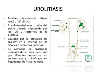 La urolitiasis, o litiasis renal, es la tercera enfermedad más común del tracto urinario, caracterizada por la formación de cálculos en los riñones y vías urinarias, con prevalencia del 3 al 4% en la población y una recidiva del 40% en casos tratados. Los cálculos están compuestos principalmente de oxalato cálcico y pueden ser inducidos por factores dietéticos, enfermedades como el hiperparatiroidismo, y condiciones ambientales. El diagnóstico y tratamiento incluyen evaluación de síntomas, estudios radiológicos, manejo del dolor y, en algunos casos, intervención quirúrgica o litotricia.