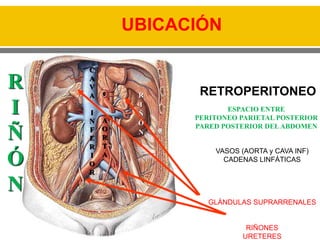 1. El documento describe la anatomía y fisiología del riñón y las vías urinarias. 2. Explica la estructura y función de las diferentes partes del riñón como la corteza, la médula y las nefronas. 3. También describe las enfermedades y alteraciones más comunes del riñón y las vías urinarias como la litiasis renal, la insuficiencia renal y la infección del tracto urinario.