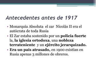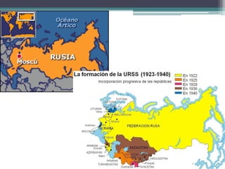 La Unión Soviética (URSS) se formó en 1922 tras la Revolución de Octubre de 1917 liderada por los bolcheviques. La URSS experimentó un rápido desarrollo industrial bajo los planes quinquenales de Stalin, pero también sufrió la brutal dictadura estalinista y las purgas que costaron millones de vidas. Tras la Segunda Guerra Mundial, la URSS reconstruyó su economía bajo el modelo de industrialización forzada, aunque esto generó problemas de abastecimiento. La URSS colapsó finalmente en 1989