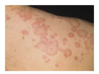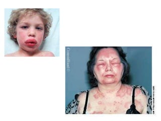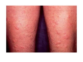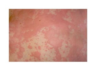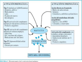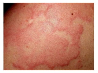 Este documento describe la urticaria, una reacción de la piel caracterizada por lesiones fugaces, eritematosas y edematosas causadas por la activación de mastocitos. Explica la etiología, patogénesis, clasificación, cuadro clínico, diagnóstico y tratamiento de la urticaria aguda y crónica.