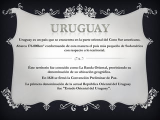 Uruguay es el país más pequeño de América del Sur, ubicado en la región oriental del Cono Sur. Logró su independencia de Brasil y Argentina en 1825 y estableció su primera constitución en 1830, adoptando ideas liberales. A lo largo del siglo XIX, Uruguay avanzó económica y socialmente gracias a la inmigración europea, el desarrollo de la ganadería ovina y la educación pública, lo que le valió el apodo de "Suiza de América".