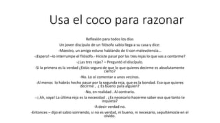 Un discípulo le cuenta a su maestro filósofo que un amigo habló mal de él. El filósofo le pregunta al discípulo si lo que va a decir ha pasado por "las tres rejas": la verdad, la bondad y la necesidad. El discípulo admite que lo que oyó no es absolutamente cierto, no es bueno para nadie y no es necesario decir. El maestro concluye que lo que no es verdad, bueno o necesario debe ser olvidado.