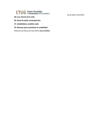 Este documento proporciona una guía sobre los principios básicos de la usabilidad en sitios web. Explica que un buen sitio web debe anticipar las necesidades de los usuarios, darles autonomía y control, usar colores con precaución, ser consistente con las expectativas de los usuarios, centrarse en la productividad del usuario, permitir deshacer acciones, optimizar el tiempo de latencia y requerir poco aprendizaje. También cubre temas como la legibilidad, el seguimiento de las acciones del usuario y la necesidad de que un sit