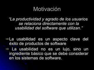 El documento describe la importancia de la usabilidad en el desarrollo de software. Define la usabilidad como la facilidad de aprendizaje, eficiencia, retención, bajo número de errores y satisfacción del usuario. Explica que la usabilidad debe considerarse desde las primeras etapas del desarrollo a través de análisis de usuarios, tareas y evaluaciones. También presenta el caso de una empresa que mejoró sus productos al incorporar procesos y técnicas de usabilidad tempranas.