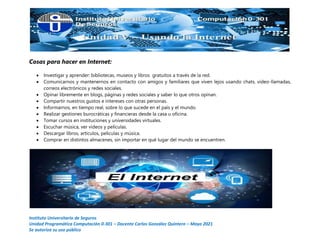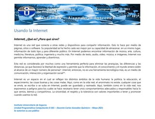 Internet es una red global que conecta computadoras y dispositivos para compartir información a través de páginas web y sitios. Permite acceder a información, comunicarse, aprender y entretenerse. Además de la web, ofrece servicios como correo electrónico, mensajería instantánea y videojuegos en línea. Su creación se atribuye al Departamento de Defensa de EE.UU. en los años 1960 para conectar computadoras de investigación, aunque también tuvo orígenes civiles.