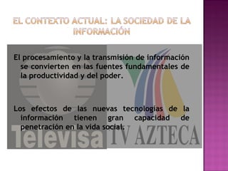El documento discute el impacto de las nuevas tecnologías de la información y la Web 2.0 en la sociedad y la educación. Explica que las TIC pueden ayudar a los estudiantes a desarrollar habilidades para usar tecnología e información de manera efectiva y ser ciudadanos informados. También destaca la necesidad de que los docentes adopten un rol de facilitadores del aprendizaje apoyado por las TIC.
