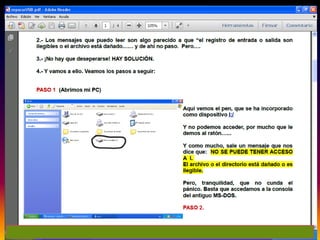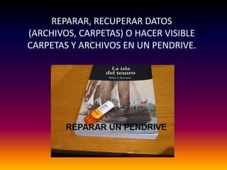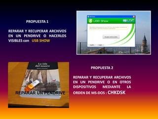 Este documento presenta dos propuestas para reparar, recuperar datos u hacer visibles archivos y carpetas en un pendrive. La Propuesta 1 utiliza el programa gratuito USB Show para recuperar archivos ocultos. La Propuesta 2 usa la orden CHKDSK de MS-DOS para reparar y recuperar archivos en un pendrive u otros dispositivos.