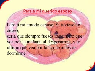 Este documento es una carta de amor de una esposa a su esposo. Ella expresa su deseo de que él sea lo primero que vea por la mañana y lo último por la noche, y que él es la persona a la que más ama en el mundo. También habla sobre cómo Dios creó el matrimonio para que dos personas se amen de por vida y se apoyen mutuamente, y sobre sus metas de criar juntos a su hija con amor y enseñanzas para que sea feliz.