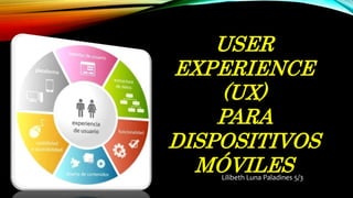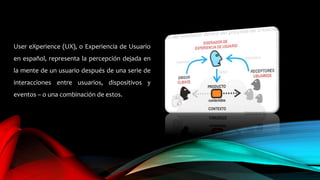 La experiencia de usuario (UX) se refiere a la percepción que queda en la mente de un usuario después de interactuar con dispositivos. Un buen diseño de UX requiere conocer bien al usuario objetivo e identificar sus necesidades y motivaciones para diseñar la interfaz, contenidos e interacciones. Factores clave como los tiempos de carga, la ubicación de los botones y los gestos que minimizan el esfuerzo del usuario son importantes de considerar. Un experto en UX evalúa críticamente la interfaz desde la perspectiva del usuario para