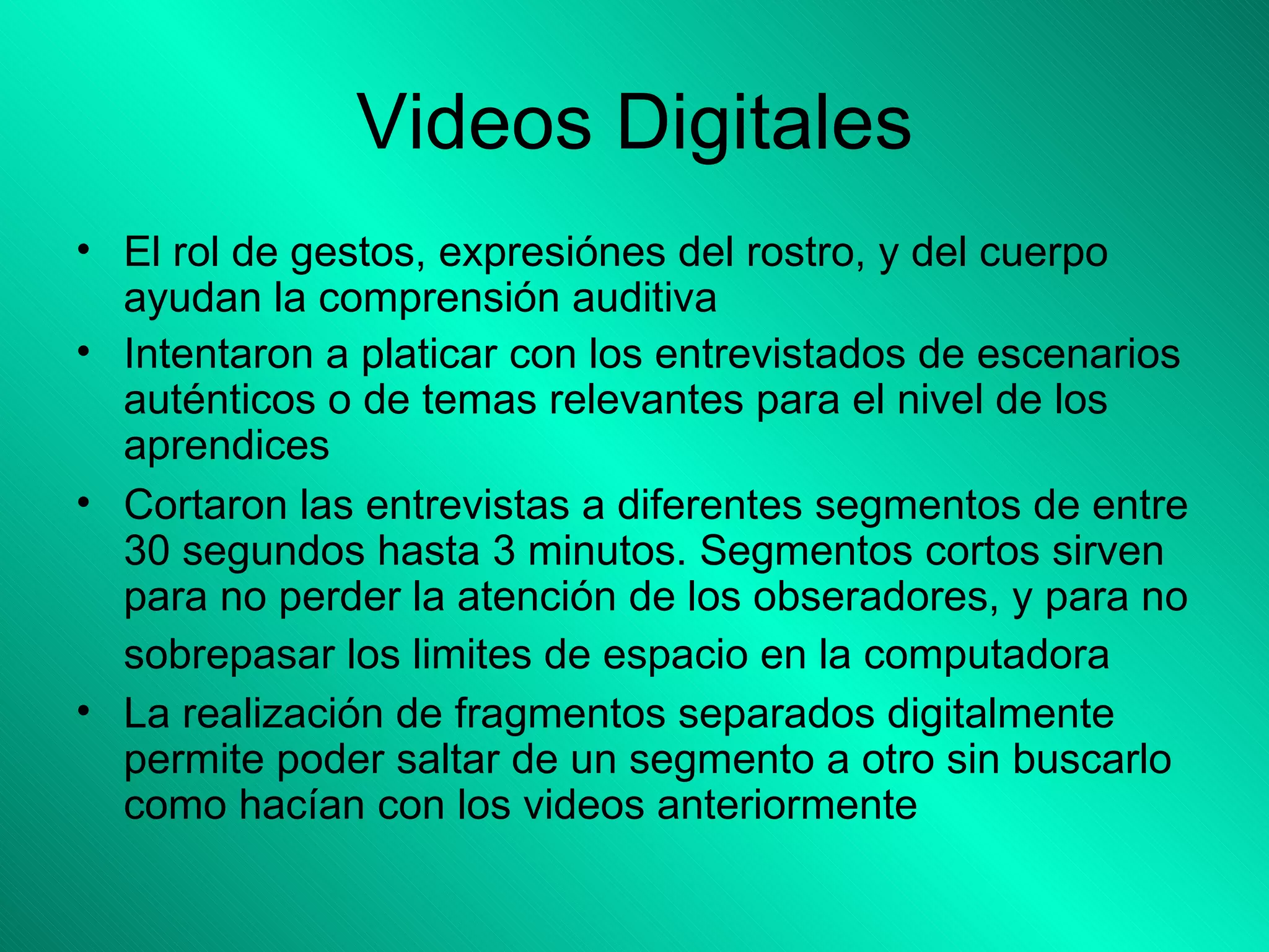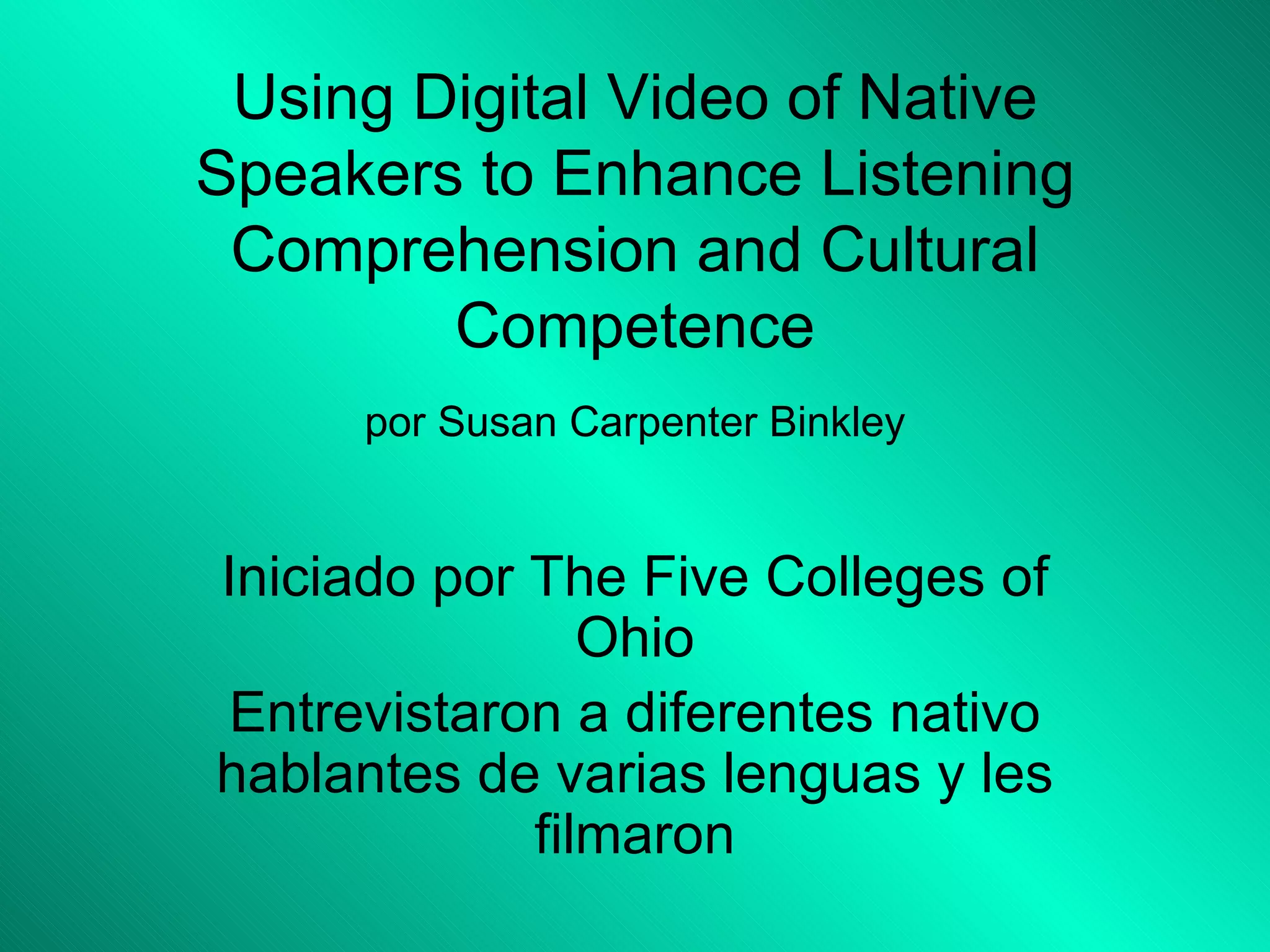 El documento describe un proyecto para crear videos digitales de entrevistas con hablantes nativos de diferentes idiomas con el fin de mejorar la comprensión auditiva y la competencia cultural de los estudiantes. Los videos muestran gestos, expresiones faciales y del cuerpo que ayudan a la comprensión. Los segmentos cortos de 30 segundos a 3 minutos permiten ver diferentes aspectos de la conversación sin perder atención o sobrepasar los límites tecnológicos. Estos videos digitales brindan a los estudiantes la oportunidad de observar de cerca