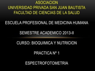 Este documento describe los procedimientos para una práctica de espectrofotometría. Incluye instrucciones para construir una curva de calibración usando soluciones estándar de bicromato de potasio y determinar la concentración de una solución desconocida mediante la curva o el factor de calibración. Explica conceptos clave como absorbancia, leyes de Beer-Lambert y uso del espectrofotómetro.