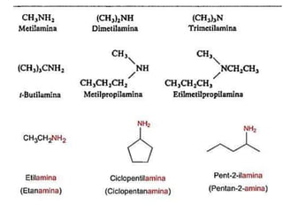 Este documento presenta información sobre diversas sustancias químicas orgánicas como aminas, amidas, catecolaminas, nitrilos, lactamas, vitaminas, alcaloides, isómeros y aminoácidos. Describe las propiedades y usos de sustancias como la adrenalina, histamina, vitamina B3, GABA, paracetamol, lactamas, barbitúricos, nitroderivados, catecolaminas, cafeína, nicotina y anfetamina. El documento también proporciona definiciones de términos como al