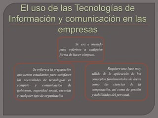 El documento habla sobre las tecnologías de la información y la comunicación (TIC) y su uso en las empresas. Explica que las TIC pueden optimizar los recursos y aumentar la calidad si se desarrollan técnica y organizacionalmente de manera adecuada. También destaca que las TIC no garantizan por sí mismas el desarrollo de capacidades sociocognitivas para su óptimo aprovechamiento.
