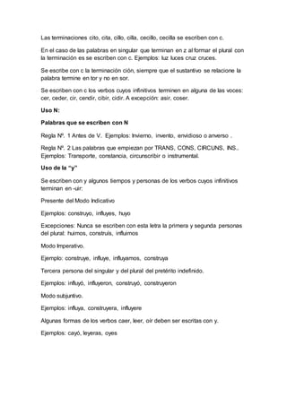 El documento describe las reglas ortográficas para el uso de las letras b, s, c, n, y, z, h y ll en palabras del español. Se especifican casos en los que estas letras se usan al principio, medio o final de palabras, así como excepciones a las reglas generales.