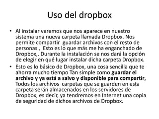 Dropbox permite compartir y guardar archivos con otros de forma sencilla. Al instalar Dropbox, aparece una nueva carpeta en el sistema donde se pueden almacenar archivos para que sean accesibles desde cualquier lugar y compartidos con otras personas de manera automática a través de los servidores de Dropbox. Esta herramienta facilita el almacenamiento y sincronización de archivos de forma segura entre dispositivos.